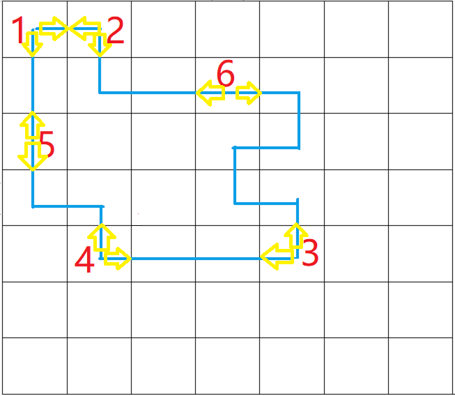 不难发现,对于回路里的任何一个方格,四条边中,有且仅有两个与表示路径的蓝色线相交。这也很好理解,进一次,出一次,C(4,2)=6。