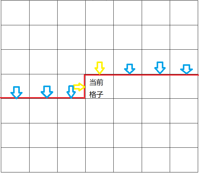 蓝色的是其它格子需要用到的,黄色的是当前格子需要用到的。我们叫红色的这个线为轮廓线。我们只需要知道这轮廓线上m+1个箭头是否存在就可以了。总共