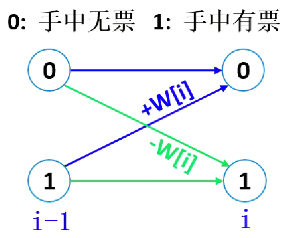 2. 有票:f[i][1]=max(f[i-1][1], f[i-1][0] - w[i])
