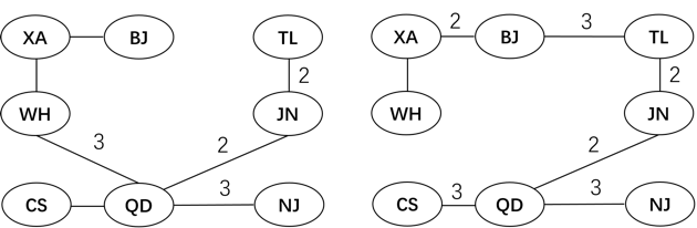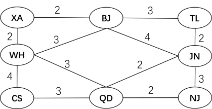 拟建设一个光通信骨干网络连通BJ、CS、XA、QD、JN、NJ、TL和WH等8个城市,题42图中无向边上的权值表示两个城市间备选光纤的铺设费用。