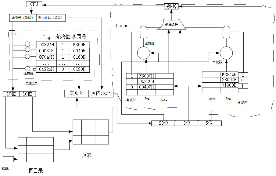 (1)由图可知,地址总长度为32位,高20位为虚页号,低12位为页内地址。且虚页号高10位为页目录号,低10位为页号。展开成二进制则表示为:0000 0001 1000 0000 0110 0000 0000 1000 B