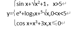 import math x=eval(input("请输入x的值:")); if x>=5: y=math.sin(x)+math.sqrt(x**2+1); elif x>=0: y=math.exp(x)+math.log(x,5)+x**(1/5); else: y=math.cos(x)-x**3+3*x print("分段函数y的值是:%.2f",%y);