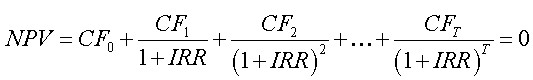 在金融中,我们有时会用内部收益率IRR来评价项目的投资财务效益,它等于使得投资净现值NPV等于0的贴现率。换句话说,给定项目的期数T、初始现金流CF0和项目各期的现金流CF1, CF2, ...,CFT,IRR是下面方程的解: