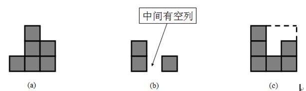A和B在玩一个射击游戏,战场由若干单位正方形积木组成。积木占据了连续的若干列,且图形周长等于它最小包围矩形的周长。下图(a)是一个合法的战场,但(b)和(c)都不是:(b)中有空列;(c)的图形周长为14,而最小包围矩形(用虚线画出)的周长为12。受重力影响,每个积木的正下方要么是地面,要么是另一个积木。为了让战场看上去错落有致、玩着更刺激,它不能恰好是一个矩形(即:不能每列积木都一样高)。