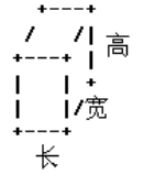 每个顶点用1个加号’+’表示,长用3个”-“表示,宽用1个”/”表示,高用两个”|”表示。字符’+’ ‘-‘’/’ ‘|’的ASCII码分别为43,45,47,124。字符’.’(ASCII码46)需要作为背景输出,即立体图里的空白部分需要用’.’代替。立体图的画法如下面的规则: 若两块积木左右相邻,图示为: