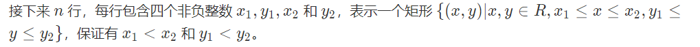对于每组测试数据,输出 n 行,其中第 i 行包含两个非负整数,用恰好一个空格隔开,这里第 i 行的第一个整数表示与输入给出的第 i个矩形严格有交集的矩形数量(不含第 i 个矩形),第二个整数表示这些矩形分别与第 i 个矩形的交集面积之和。
