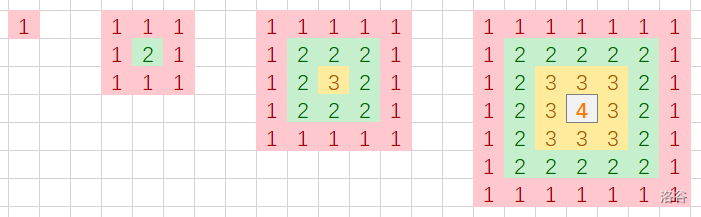 如果一个 (2k-1*(2k-1) 的正方形土地满足最外圈的高度是 1,第二圈的高度是 2……以此类推,它就是一个高度为 k 的金字塔。下图是高度为 1 到 4 的金字塔的示例: