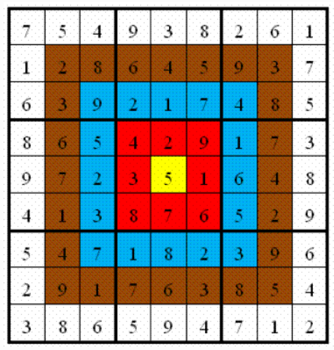上图具体的分值分布是:最里面一格(黄色区域)为 10 分,黄色区域外面的一圈(红色区域)每个格子为9 分,再外面一圈(蓝色区域)每个格子为8 分,蓝色区域外面一圈(棕色区域)每个格子为7 分,最外面一圈(白色区域)每个格子为6 分,如上图所示。比赛的要求是:每个人必须完成一个给定的数独(每个给定数独可能有不同的填法),而且要争取更高的总分数。而这个总分数即每个方格上的分值和完成这个数独时填在相应格上的数字的乘积的总和。如图,在以下的这个已经填完数字的靶形数独游戏中,总分数为2829。游戏规定,将以总分数的高低决出胜负。