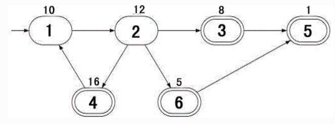 市中心在路口 1,由一个入口符号 → 来标识,那些有酒吧的路口用双圈来表示。每个 ATM 机中可取的钱数标在了路口的上方。在这个例子中,Banditji 能抢劫的现金总数为 47,实施的抢劫路线是:1−2−4−1−2−3−5。