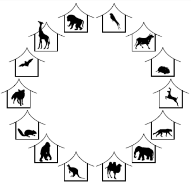新建的圆形动物园是亚太地区的骄傲。圆形动物园坐落于太平洋的一个小岛上,包含一大圈围栏,每个围栏里有一种动物。如下图所示: