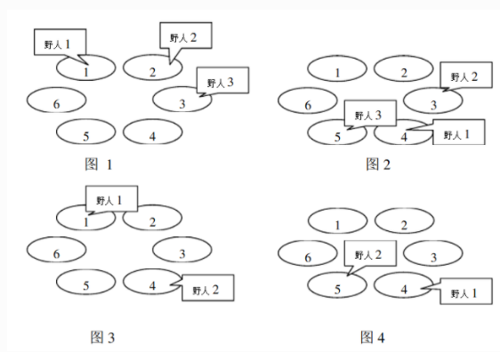 岛上住着 N 个野人,一开始依次住在山洞 C1,C2,⋯,CN 中,以后每年,第 i 个野人会沿顺时针向前走 Pi个洞住下来。每个野人 i 有一个寿命值 Li ,即生存的年数。下面四幅图描述了一个有 6 个山洞,住有三个野人的岛上前四年的情况。三个野人初始的洞穴编号依次为 1,2,3;每年要走过的洞穴数依次为 3,7,2;寿命值依次为 4,3,1。