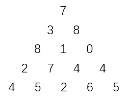 上图给出了一个数字三角形。从三角形的顶部到底部有很多条不同的路径。对于每条路径,把路径上面的数加起来可以得到一个和,你的任务就是找到最大的和。