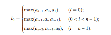 小蓝有一个长度为 n 的数组 B = (b0, b1, · · · , bn−1),数组 B 是由另一个长度为 n 的环形数组 A = (a0, a1, · · · , an−1) 经过一次相邻最大化操作得到的,其中 ai 与 ai+1 相邻,a0 与 an−1 相邻。