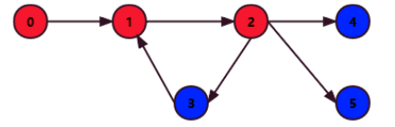样例如上图所示,选择 0 号顶点作为起点,按照 0 → 1 → 2 → 3 → 1 → 2 → 4 的行进路线,可以获得 3 颗红宝石和 2 颗蓝宝石,最终可以合成 2 颗紫晶宝石;他也可以按照 1 → 2 → 3 → 1 → 2 → 4 行进,结果也是 2 。找不到比 2 更大的答案了。