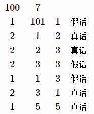 以下K行每行是三个正整数 D,X,Y,两数之间用一个空格隔开,其中D表示说法的种类。