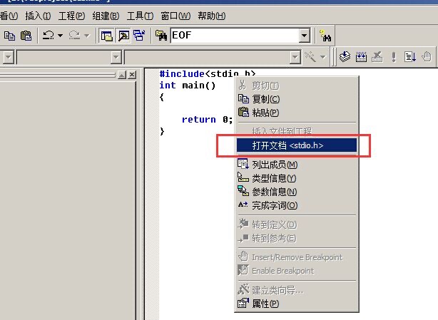 首先大家明确一点,教材上没有,并不是没有给大家讲解完整,大家应该借助我们学习的语法来理解这个东西是什么EOF,如果完整学习过C语言,看到三个大写字母,你首先应该联想到C语言当中的宏定义,因为宏定义有个不成文的规定,那就是宏名往往是大写,因此我们就可以按照这个思路,在编译器当中查找这个宏定义是否存在来验证。笔者这里以VC6编译器为例,可以随便写一个包含stdio.h这个头文件C语言的代码,鼠标光标移动至这个头文件这里点击鼠标右键,打开stdio.h这个头文件,如图: