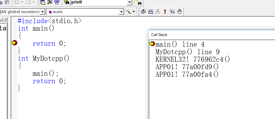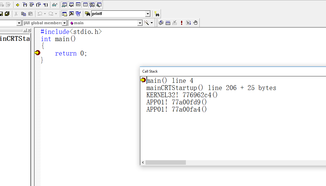 通过断点提示,我们看到目前程序位于main函数第四行。可以看到上一次是被mainCRTStartup函数调用,在第206行的25个字节偏移处开始调用,再之前就是KERNEL32了,它是windows系统三大主要文件之一。软件系统层面的调用就到此为止了。