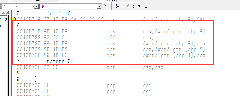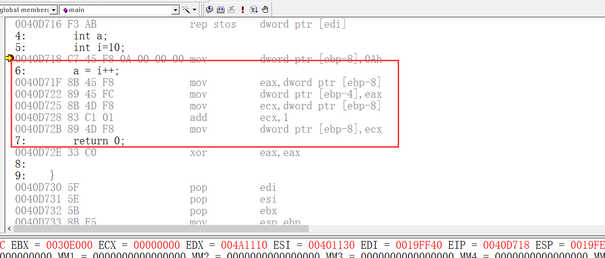 在++语句之前,我们下断点,然后点击view-Debug Windows-Disassembly 打开反汇编窗口,可以看到a = i++;这句话对应的汇编语句,如下: