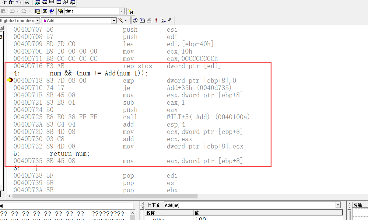 下面我们断点反汇编,查看重点num && (num += Add(num-1));语句的汇编代码,如下