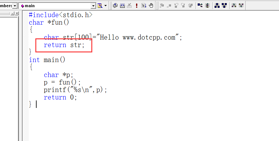 原因大家可以从str的属性入手,str本身是一个自定义函数中的局部变量,是一个数组有一百个字节,它的生命周期当然也随着它所在的函数一起,正所谓“一招天子一朝臣”,随着fun函数调用的结束,其中的各种局部变量也将被系统收回,理所当然的str数组这一百个字节也将被收回,所以”Hello www.dotcpp.com”这串字符串也就灰飞烟灭了!自然你在main函数里再输出肯定已经不是原来的内容了!