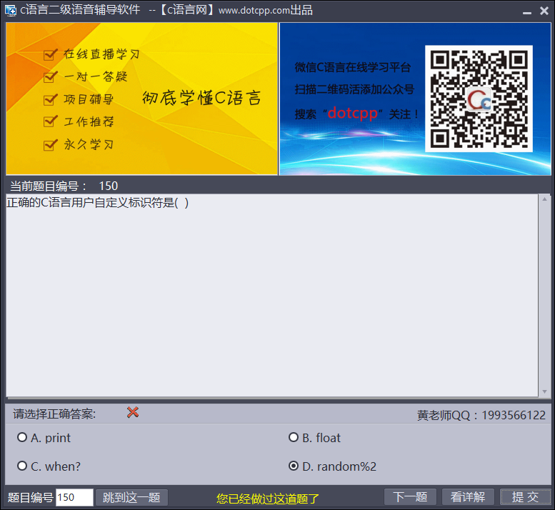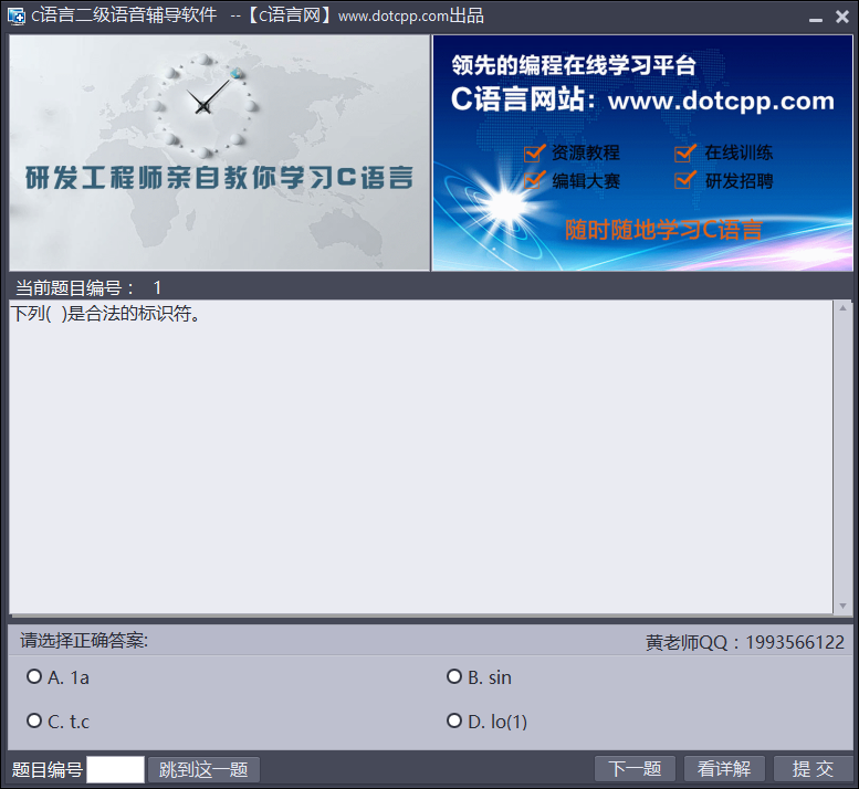 简介:这套<<二级C语言语音辅导软件>>是黄老师针对学习 C语言想过计算机二级以及期末等考试同学开发的一套知识点巩固提升的语音辅导软件。针对C语言一些常见题、易错、难点题的考察,提供文字解释以及黄老师亲自录音答疑。让同学们如临身境,提高学习效果!